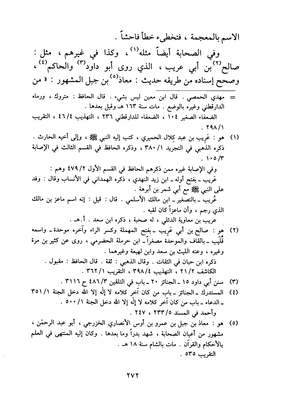 وفي الصحابة أيضاً مثله، وكذا في غيرهم، مثل: صالح بن أبي عريب، الذي روى أبو داود والحاكم , وصحح إسناده من طريقه حديث: معاذ بن جبل المشهور: "من