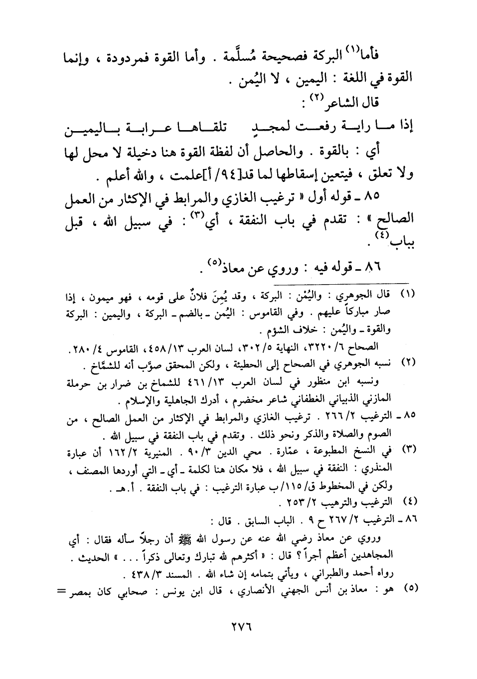 فأما البركة فصحيحة مُسلَّمة. وأما القوة فمردودة، وإنما القوة في اللغة: اليمين، لا اليُمن.