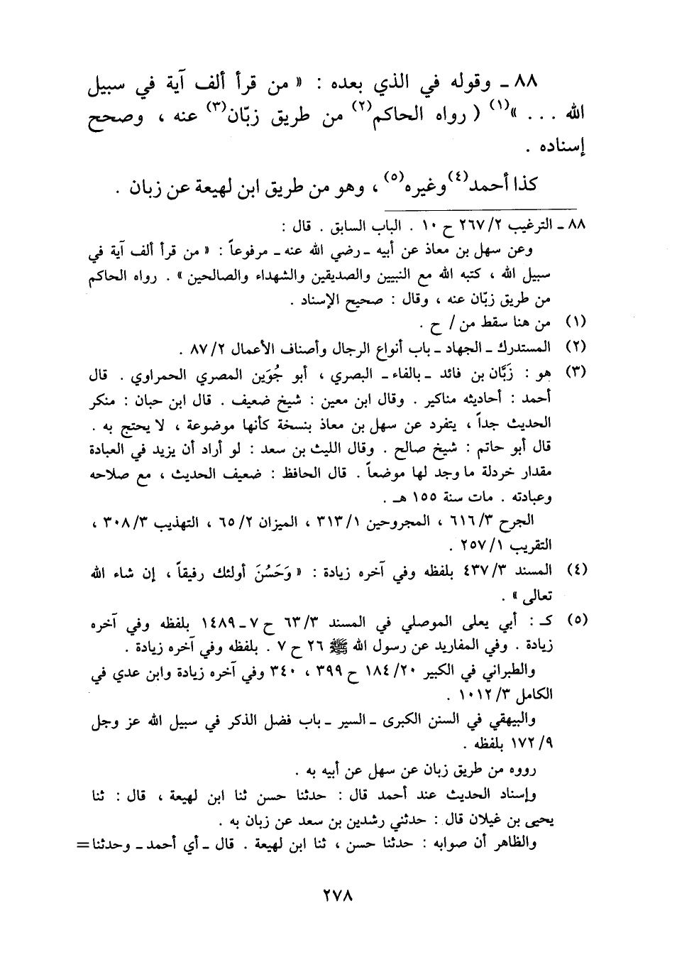 ٨٨ - وقوله في الذي بعده: "من قرأ ألف آية في سبيل الله ... " (رواه الحاكم من طريق زبّان عنه، وصحح إسناده.
