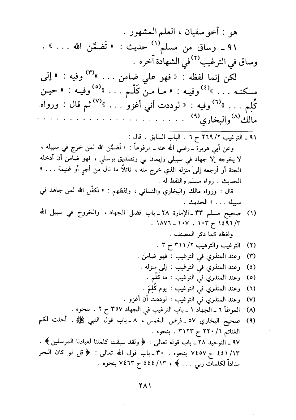 ٩١ - وساق من مسلم حديث: "تَضمَّن الله ... ".