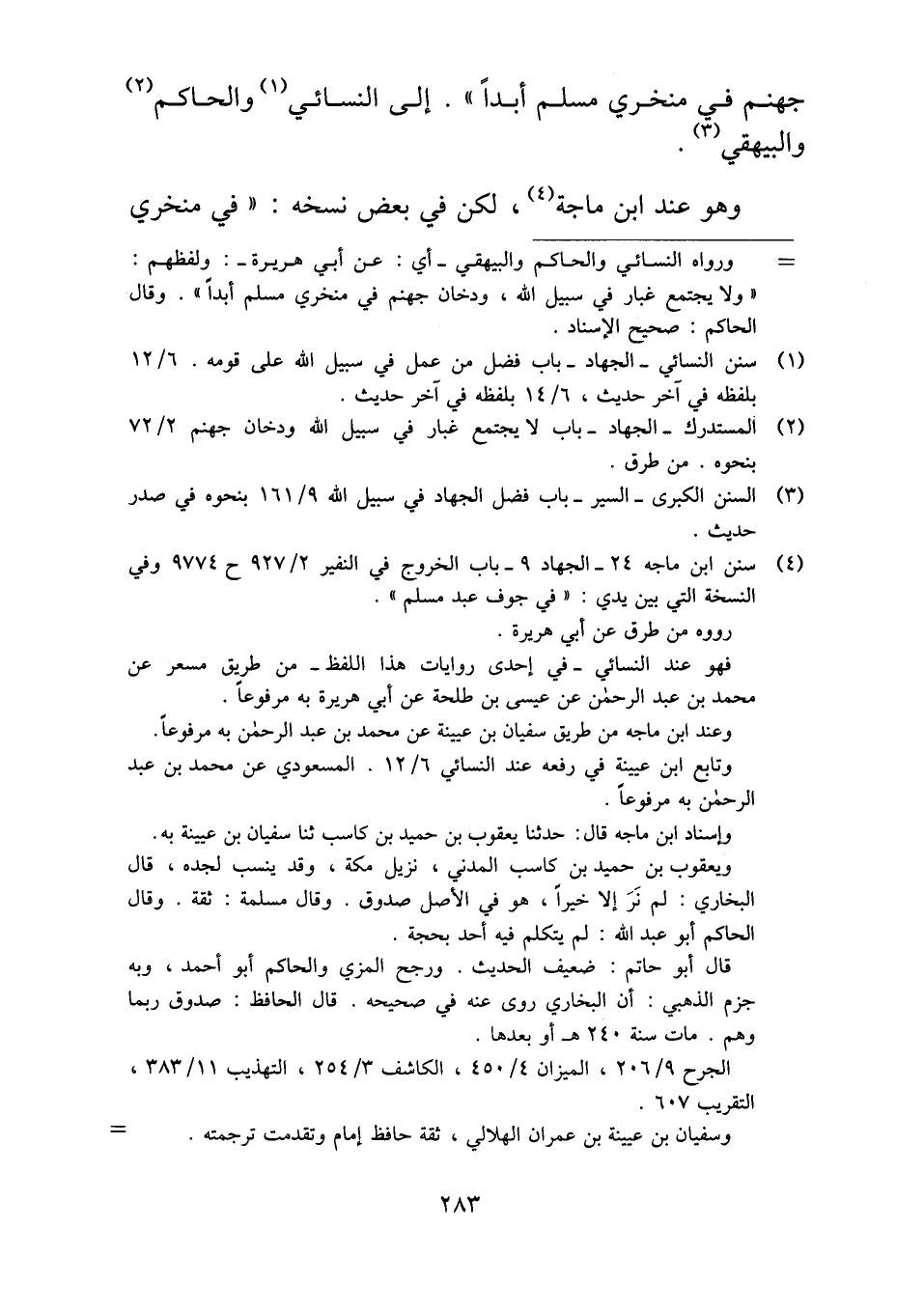 جهنم في منخري مسلم أبداً". إلى النسائي والحاكم والبيهقي.