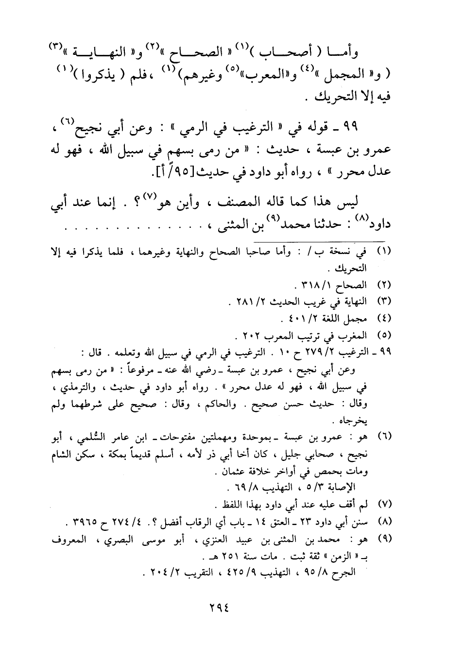 ٩٩ - قوله في "الترغيب في الرمي": وعن أبي نجيح، عمرو بن عبسة، حديث: "من رمى بسهم في سبيل الله، فهو له عدل محرر"، رواه أبو داود في حديث.