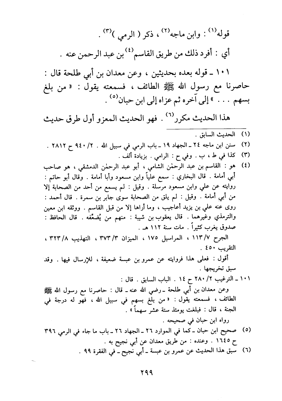 ١٠١ - قوله بعده بحديثين، وعن معدان بن أبي طلحة قال: حاصرنا مع رسول الله - صلى الله عليه وسلم - الطائف، فسمعته يقول: "من بلغ بسهم ... " إلى آخره ثم عزاه إلى ابن حبان.