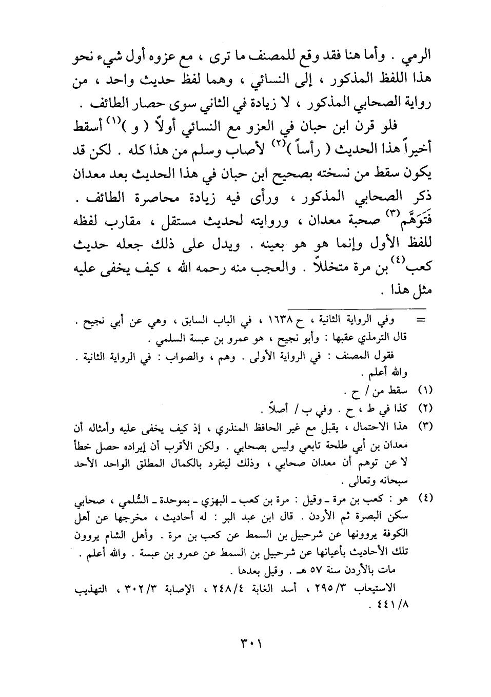 فَتَوَهَّم صحبة معدان، وروايته لحديث مستقل، مقارب لفظه للفظ الأول وإنما هو هو بعينه. ويدل على ذلك جعله حديث كعب بن مرة متخللاً. والعجب منه رحمه الله، كيف يخفى عليه مثل هذا.