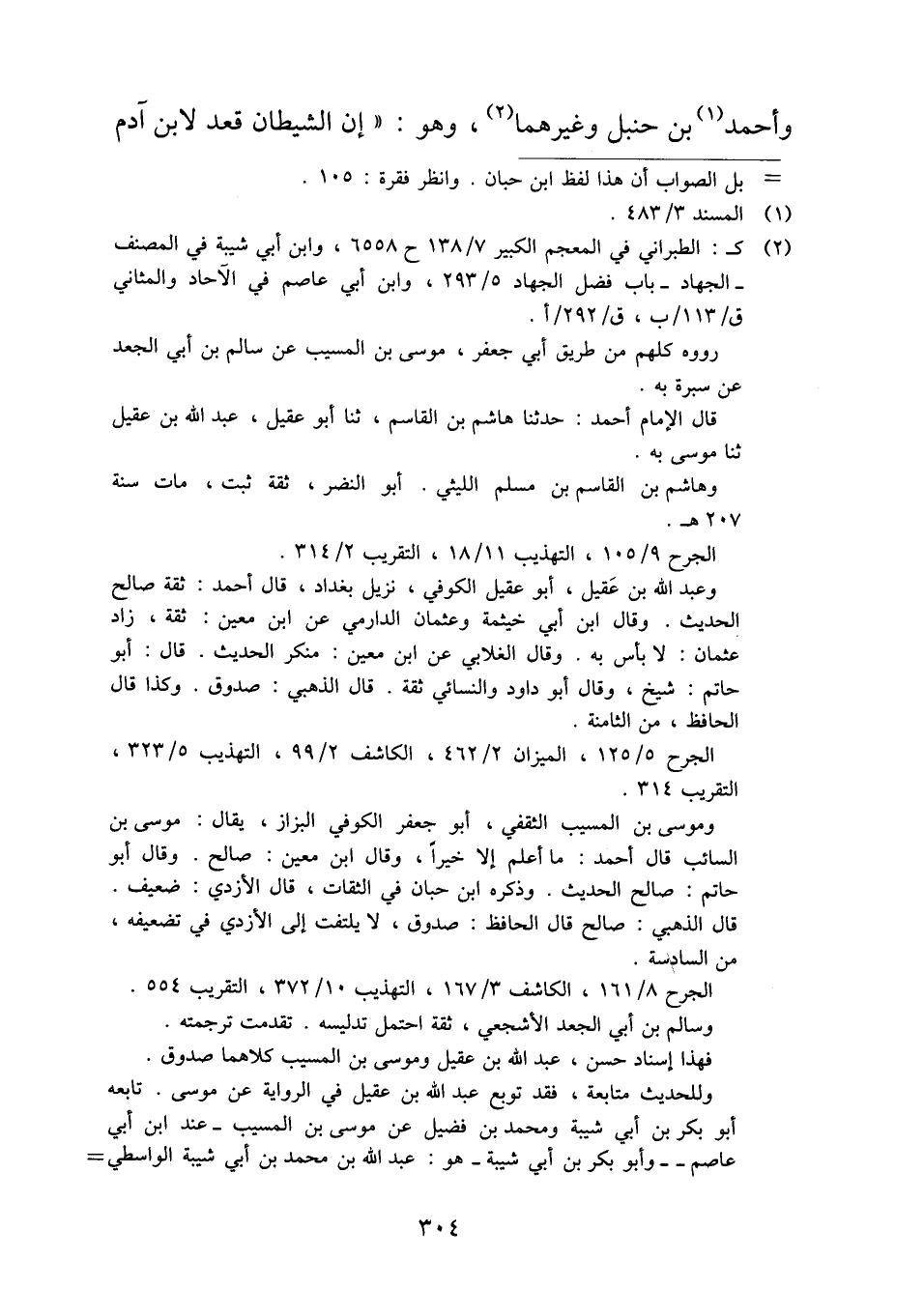 وأحمد بن حنبل وغيرهما، وهو: "إن الشيطان قعد لابن آدم