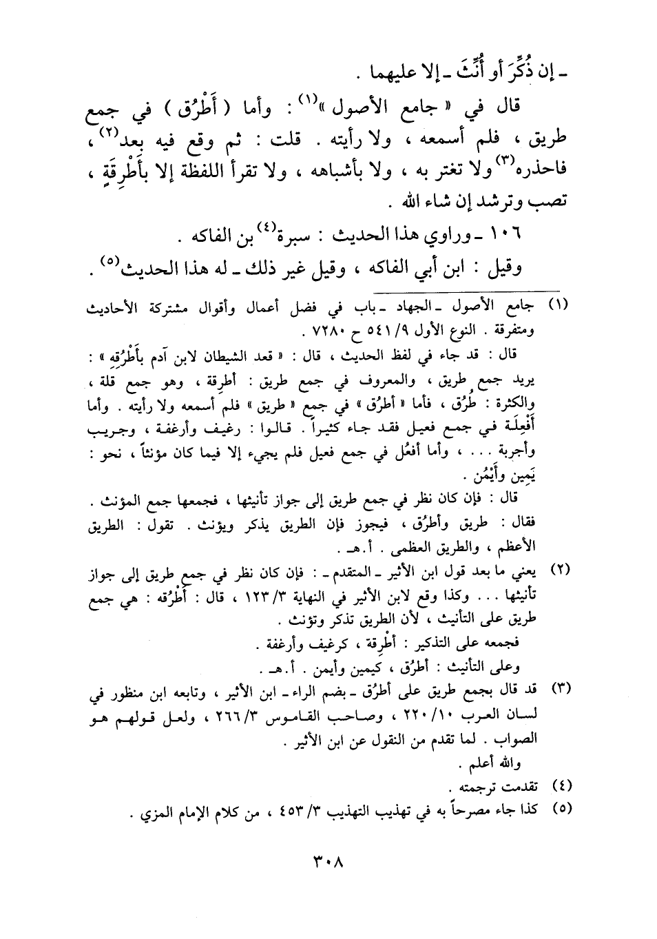 قال في "جامع الأصول": وأما (أَطْرُق) في جمع طريق، فلم أسمعه، ولا رأيته. قلت: ثم وقع فيه بعد، فاحذره ولا تغتر به، ولا بأشباهه، ولا تقرأ اللفظة إلا بأَطْرِقةٍ، تصب وترشد إن شاء الله.