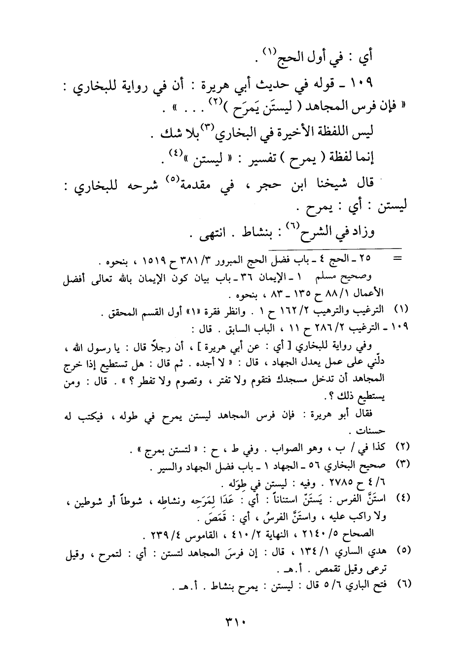 ١٠٩ - قوله في حديث أبي هريرة: أن في رواية للبخاري: "فإن فرس المجاهد (ليستَن يَمرَح) ... ".