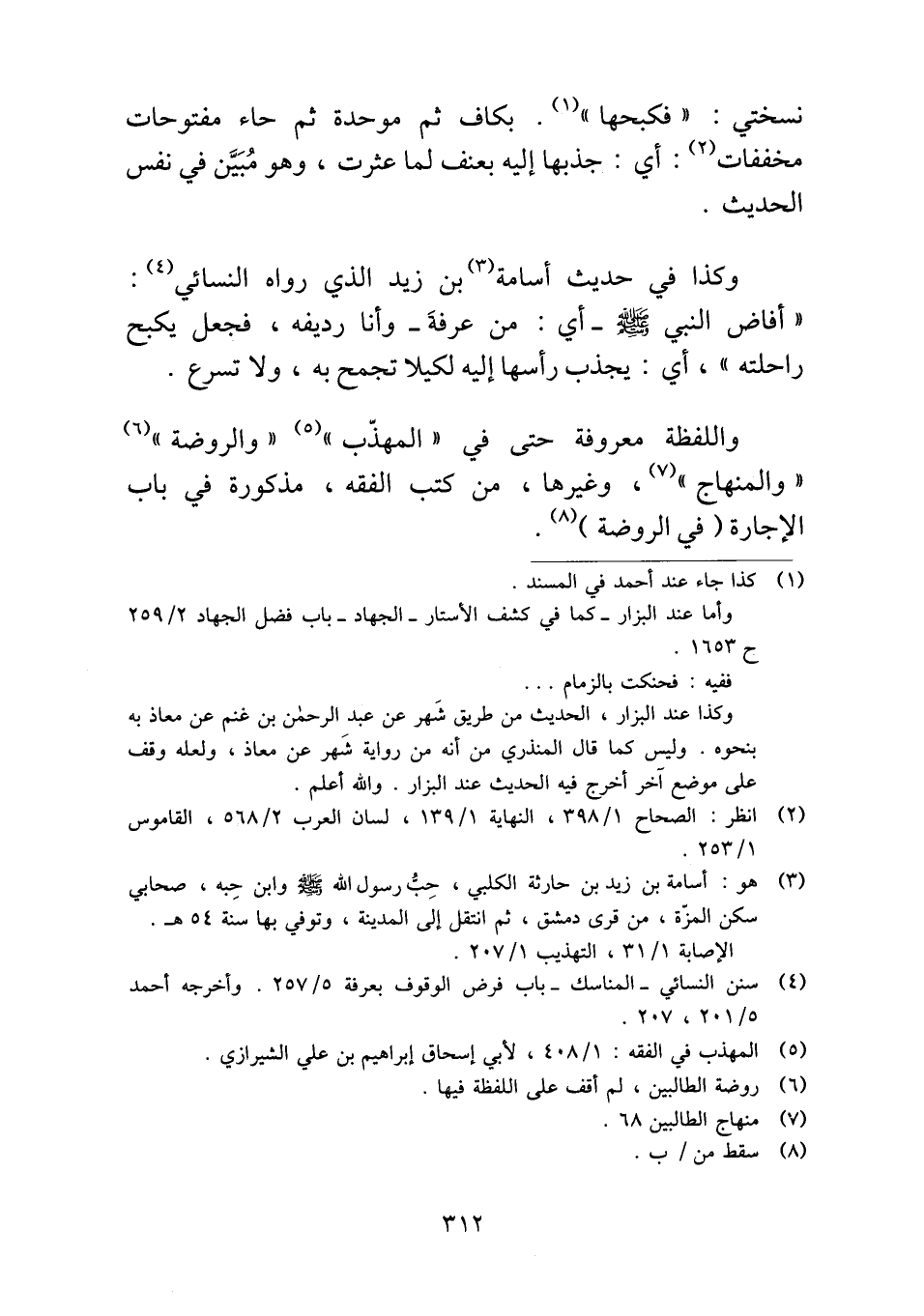 وكذا في حديث أسامة بن زيد الذي رواه النسائي: "أفاض النبي- صلى الله عليه وسلم- أي: من عرفةَ -وأنا رديفه، فجعل يكبح راحلته"، أي: يجذب رأسها إليه لكيلا تجمح به، ولا تسرع.