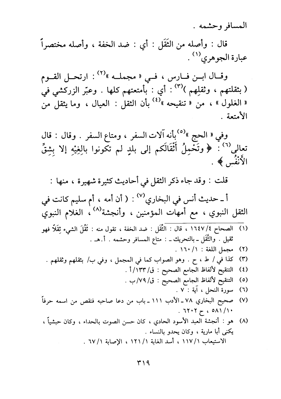 وقال ابن فارس، في "مجمله": ارتحل القوم (بثقلتهم، وثقلِهم): أي: بأمتعتهم كلها. وعبّر الزركشي في "الغلول"، من "تنقيحه" بأن الثقل: العيال، وما يثقل من الأمتعة.