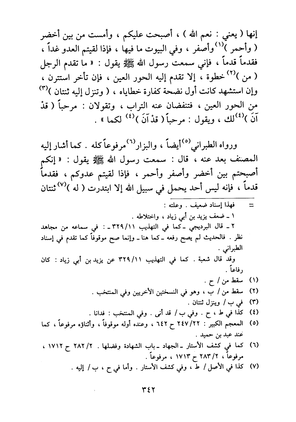 ورواه الطبراني أيضاً، والبزار مرفوعاً كله. كما أشار إليه المصنف بعد عنه، قال: سمعت رسول الله - صلى الله عليه وسلم - يقول: "إنكم أصبحتم بين أخضر وأصفر وأحمر، فإذا لقيتم عدوكم، فقدماً قدماً، فإنه ليس أحد يحمل في سبيل الله إلا ابتدرت (له) ثنتان