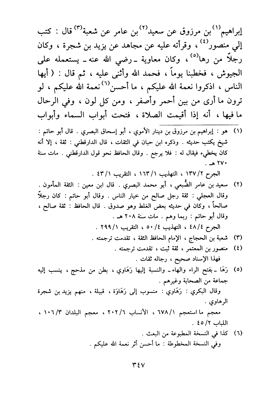إبراهيم بن مرزوق عن سعيد بن عامر عن شعبة قال: كتب إلي منصور، وقرأته عليه عن مجاهد عن يزيد بن شجرة، وكان رجلاً من رها، وكان معاوية -رضي الله عنه- يستعمله على الجيوش، فخطبنا يوماً، فحمد الله وأثنى عليه، ثم قال: (أيها الناس، اذكروا نعمة الله عليكم، ما أحسن نعمة الله عليكم، لو ترون ما أرى من بين أحمر وأصفر، ومن كل لون، وفي الرحال ما فيها، أنه إذا أقيمت الصلاة، فتحت أبواب السماء وأبواب
