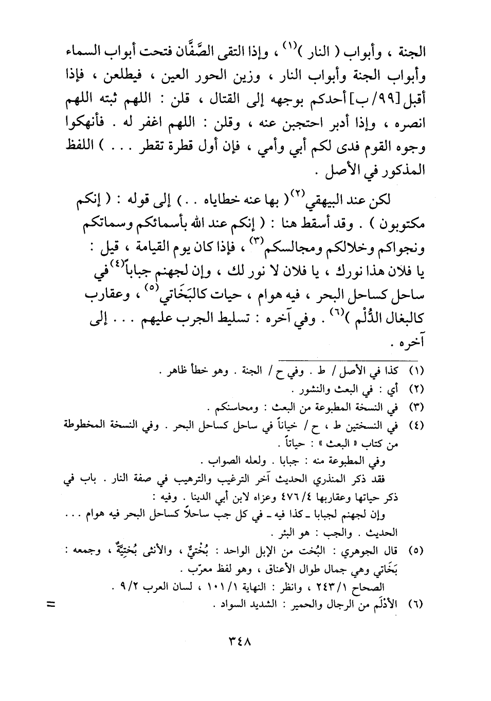 لكن عند البيهقي (بها عنه خطاياه .. ) إلى قوله: (إنكم مكتوبون). وقد أسقط هنا: (إنكم عند الله بأسمائكم وسماتكم ونجواكم وخلالكم ومجالسكم، فإذا كان يوم القيامة، قيل: يا فلان هذا نورك، يا فلان لا نور لك، وإن لجهنم جباباً في ساحل كساحل البحر، فيه هوام، حيات كالبَخَاتي، وعقارب كالبغال الدُّلْم). وفي آخره: تسليط الجرب عليهم ... إلى آخره.
