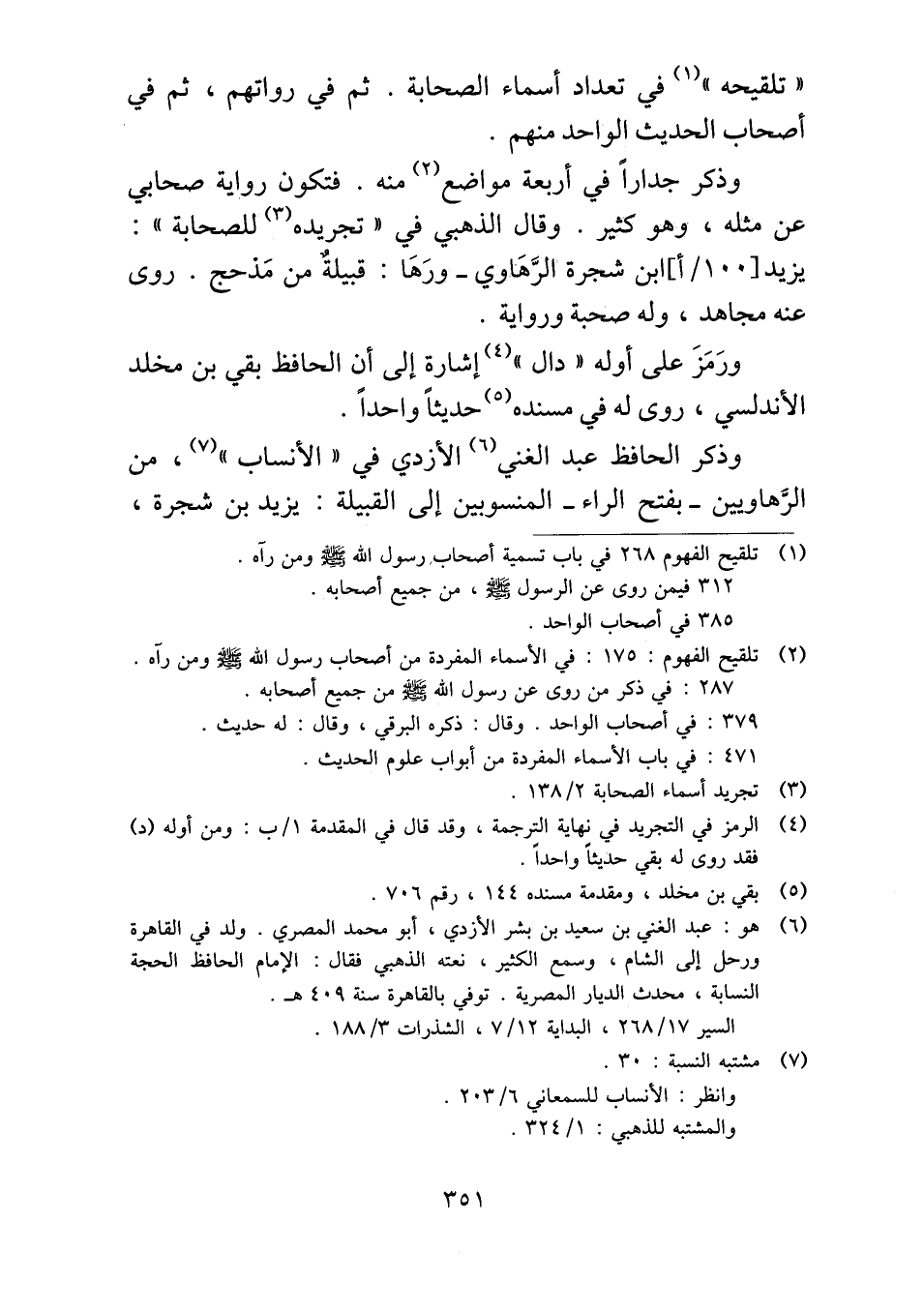 "تلقيحه" في تعداد أسماء الصحابة. ثم في رواتهم، ثم في أصحاب الحديث الواحد منهم.