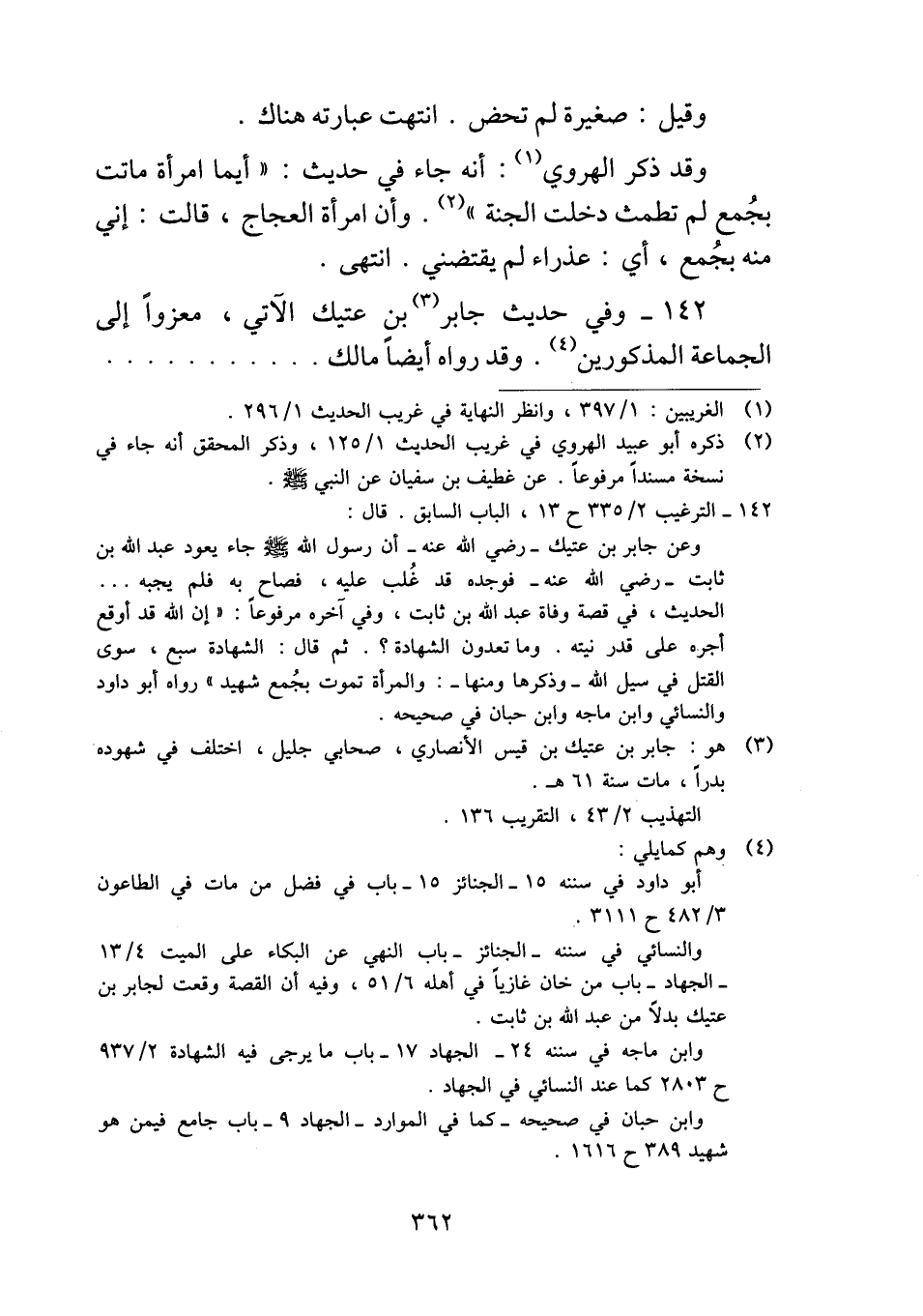 ١٤٢ - وفي حديث جابر بن عتيك الآتي، معزواً إلى الجماعة المذكورين. وقد رواه أيضاً مالك
