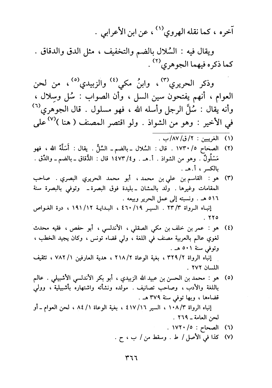 وذكر الحريري، وابنُ مكي والزبيدي، من لحن العوام، أنهم يفتحون سين السل، وأن الصواب: سُل وسِلال، وأنه يقال: سُلَّ الرجل وأسله الله، فهو مسلول. قال الجوهري في الأخير: وهو من الشواذ. ولو اقتصر المصنف (هنا) على