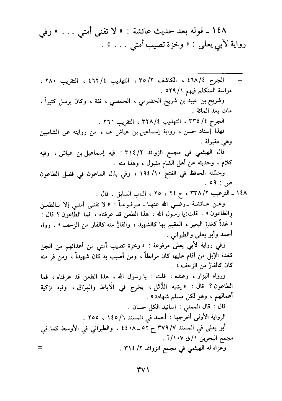 ١٤٨ - قوله بعد حديث عائشة: "لا تفنى أمتي ... " وفي رواية لأبي يعلى: "وخزة تصيب أمتي ... ".