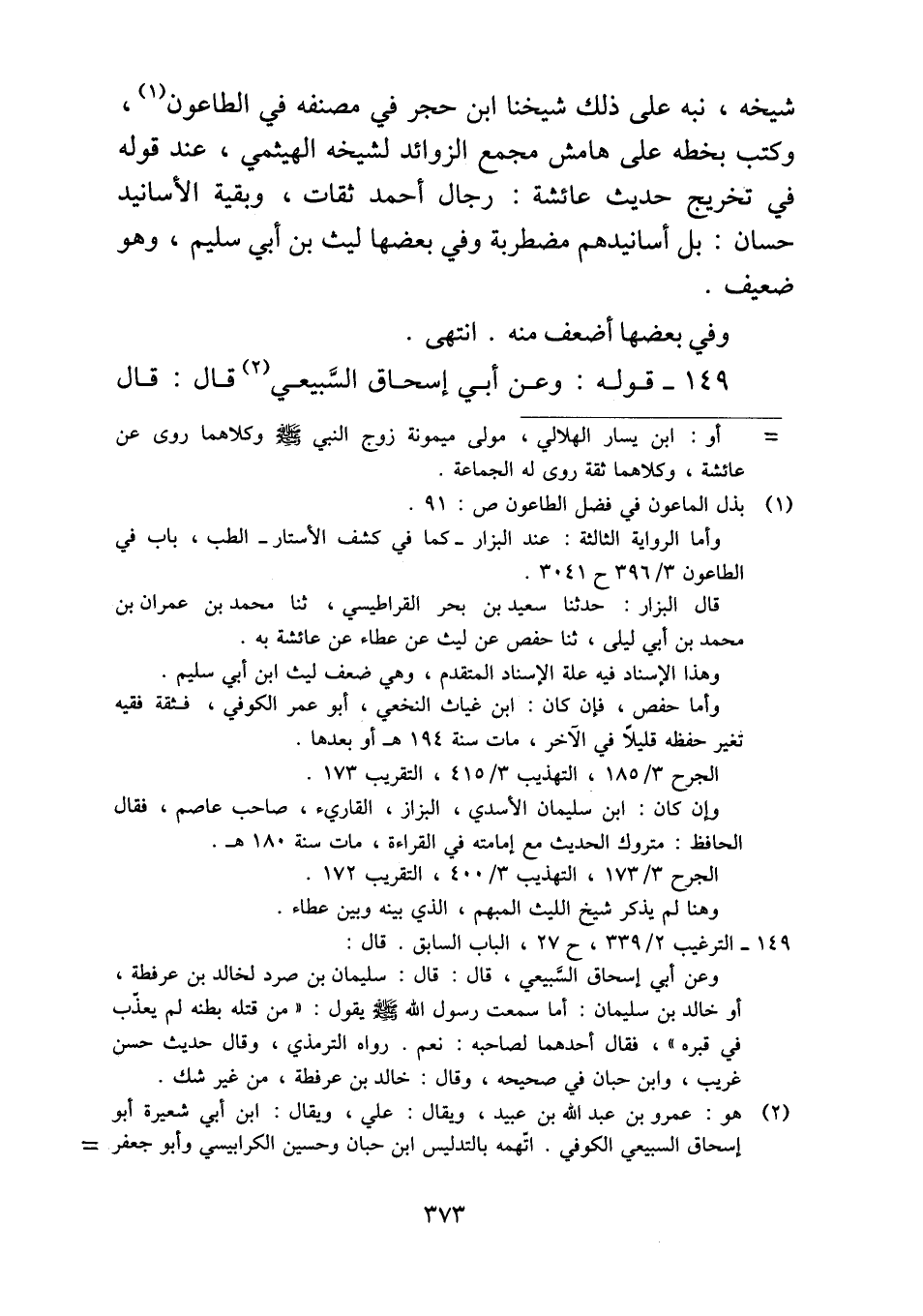 شيخه، نبه على ذلك شيخنا ابن حجر في مصنفه في الطاعون، وكتب بخطه على هامش مجمع الزوائد لشيخه الهيثمي، عند قوله في تخريج حديث عائشة. رجال أحمد ثقات، وبقية الأسانيد حسان: بل أسانيدهم مضطربة وفي بعضها ليث بن أبي سليم، وهو ضعيف.