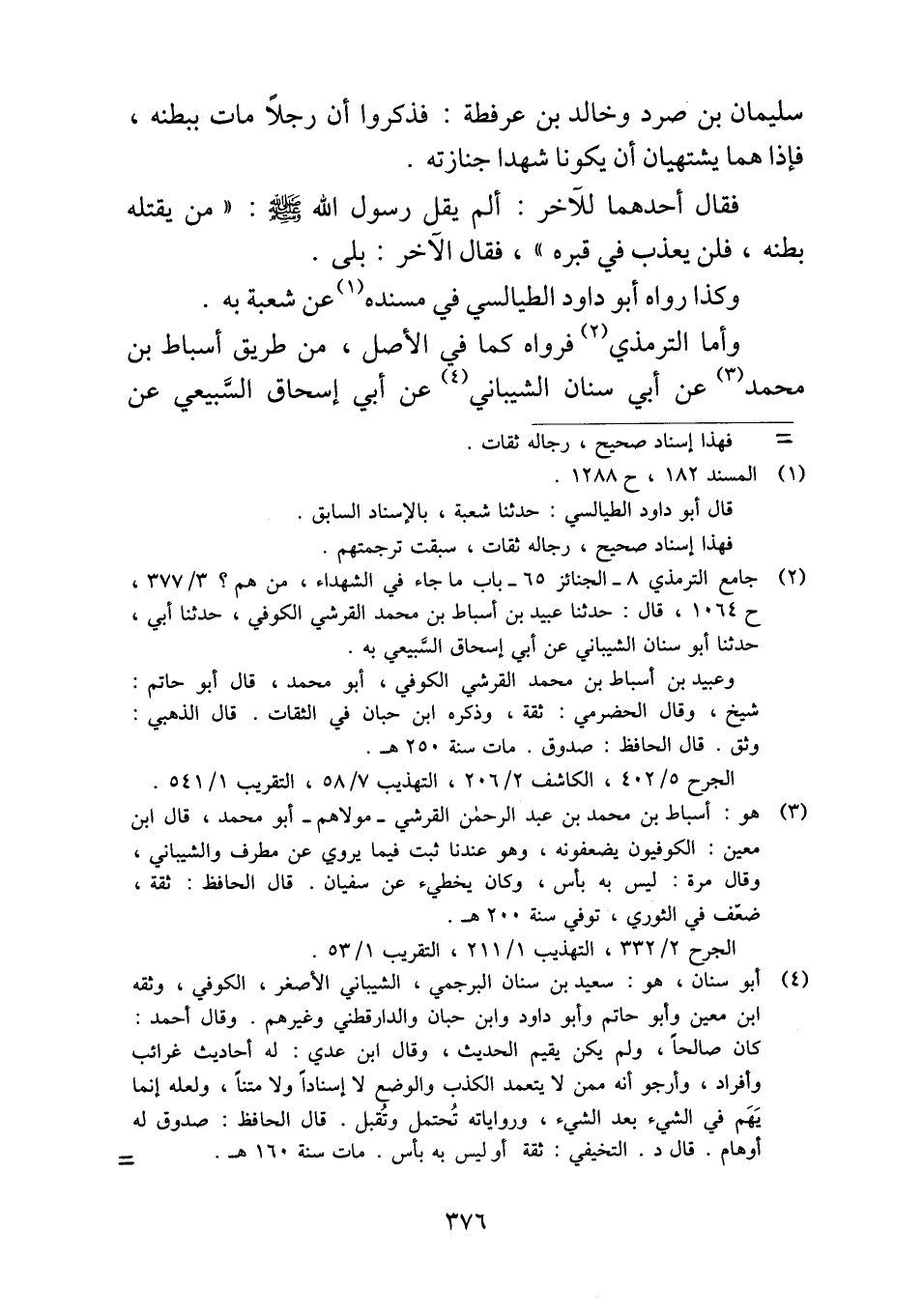 فقال أحدهما للآخر: ألم يقل رسول الله - صلى الله عليه وسلم -: "من يقتله بطنه، فلن يعذب في قبره"، فقال الآخر: بلى.