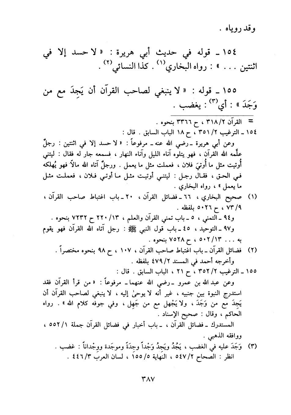 ١٥٤ - قوله في حديث أبي هريرة: "لا حسد إلا في اثنتين ... ": رواه البخاري. كذا النسائي.