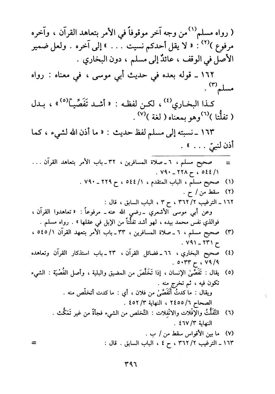 (رواه مسلم من وجه آخر موقوفاً في الأمر بتعاهد القرآن، وآخره مرفوع): "لا يقل أحدكم نسيت ... " إلى آخره. ولعل ضمير الأصل في الوقف، عائدٌ إلى مسلم، دون البخاري.