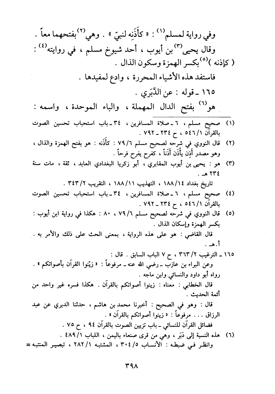 وقال يحيى بن أيوب، أحد شيوخ مسلم، في روايته: (كإذنه) بكسر الهمزة وسكون الذال.