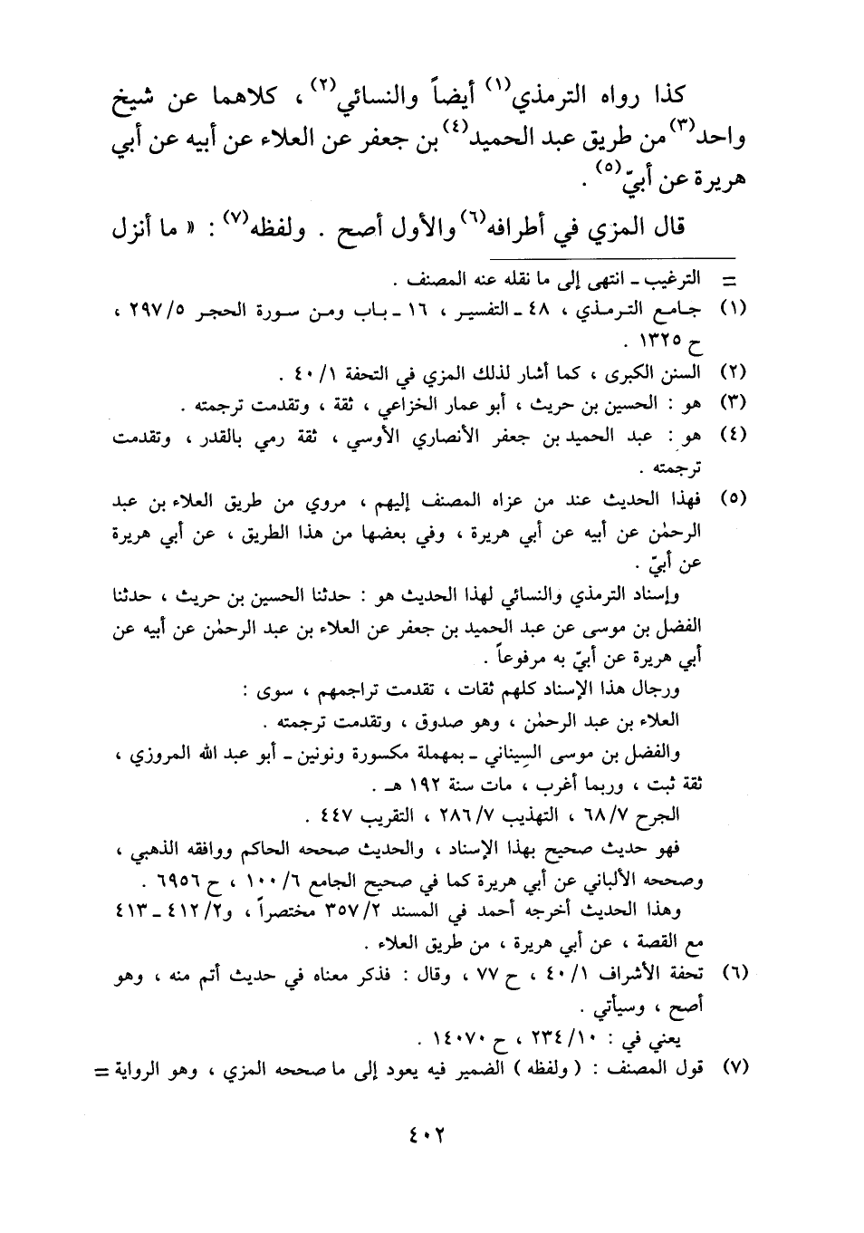 كذا رواه الترمذي أيضاً والنسائي، كلاهما عن شيخ واحد من طريق عبد الحميد بن جعفر عن العلاء عن أبيه عن أبي هريرة عن أبيّ.