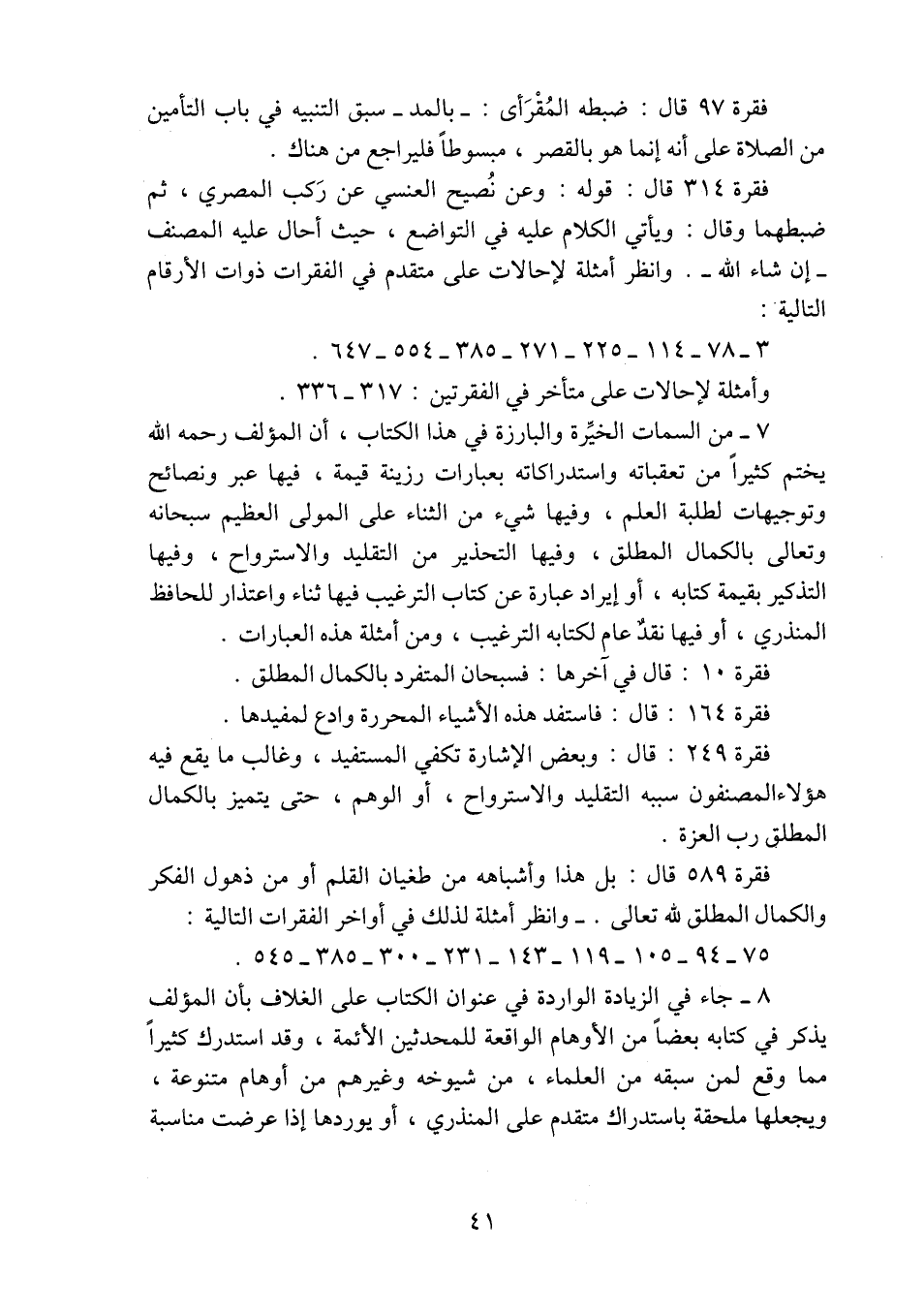 ٧ - من السمات الخيِّرة والبارزة في هذا الكتاب، أن المؤلف رحمه الله يختم كثيراً من تعقباته واستدراكاته بعبارات رزينة قيمة، فيها عبر ونصائح وتوجيهات لطلبة العلم، وفيها شيء من الثناء على المولى العظيم سبحانه وتعالى بالكمال المطلق، وفيها التحذير من التقليد والاسترواح، وفيها التذكير بقيمة كتابه، أو إيراد عبارة عن كتاب الترغيب فيها ثناء واعتذار للحافظ المنذري، أو فيها نقدٌ عام لكتابه الترغيب، ومن أمثلة هذه العبارات.
