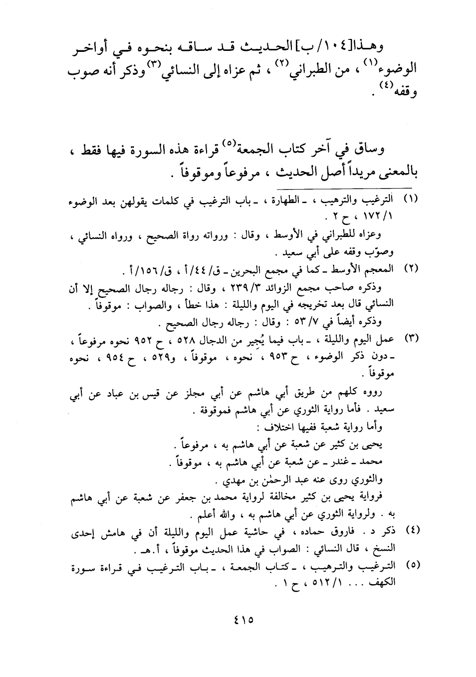 وهذا الحديث قد ساقه بنحوه في أواخر الوضوء، من الطبراني، ثم عزاه إلى النسائي وذكر أنه صوب وقفه.