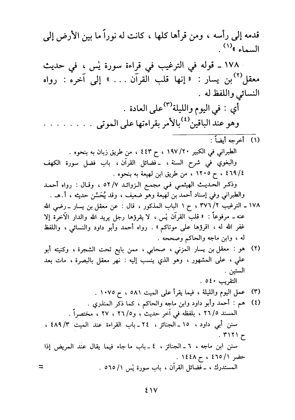 ١٧٨ - قوله في الترغيب في قراءة سورة يس، في حديث معقل بن يسار: "إنها قلب القرآن ... " إلى آخره: رواه النسائي واللفظ له.