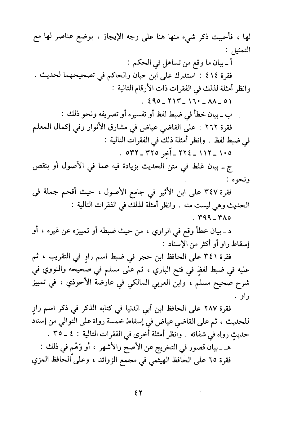 فقرة ٣٤١ على الحافظ ابن حجر في ضبط اسم راوٍ في التقريب، ثم عليه في ضبط لفظٍ في فتح الباري، ثم على مسلم في صحيحه والنووي في شرح صحيح مسلم، وابن العربي المالكي في عارضة الأحوذي، في تمييز راو.