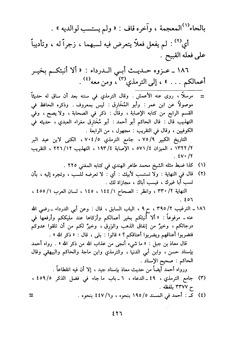 ١٨٦ - عزوه حديث أبي الدرداء: "ألا أنبئكم بخير أعمالكم ... "، إلى الترمذي، ومن معه.