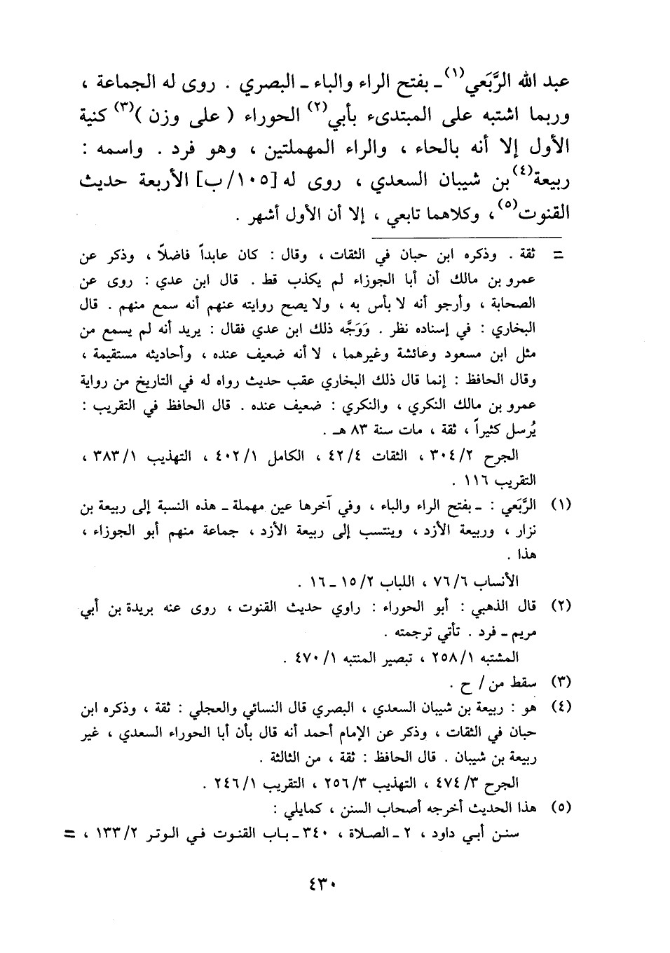 عبد الله الرَّبَعي -بفتح الراء والباء- البصري. روى له الجماعة، وربما اشتبه على المبتدىء بأبي الحوراء (على وزن) كنية الأول إلا أنه بالحاء، والراء المهملتين، وهو فرد. واسمه: ربيعة بن شيبان السعدي، روى له الأربعة حديث القنوت، وكلاهما تابعي، إلا أن الأول أشهر.