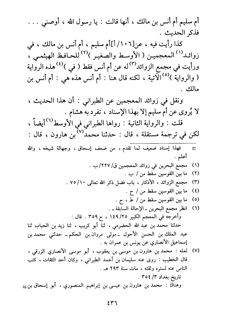 كذا رأيت فيه، عن أم سليم، أم أنس بن مالك، في زوائد المعجمين (الأوسط والصغير) للحافظ الهيثمي، ورأيت في مجمع الزوائد له عن أم أنس فقط (في) هذه الرواية (والرواية) الآتية، لكنه قال هنا: أم أنس هذه هي: أم أنس بن مالك.
