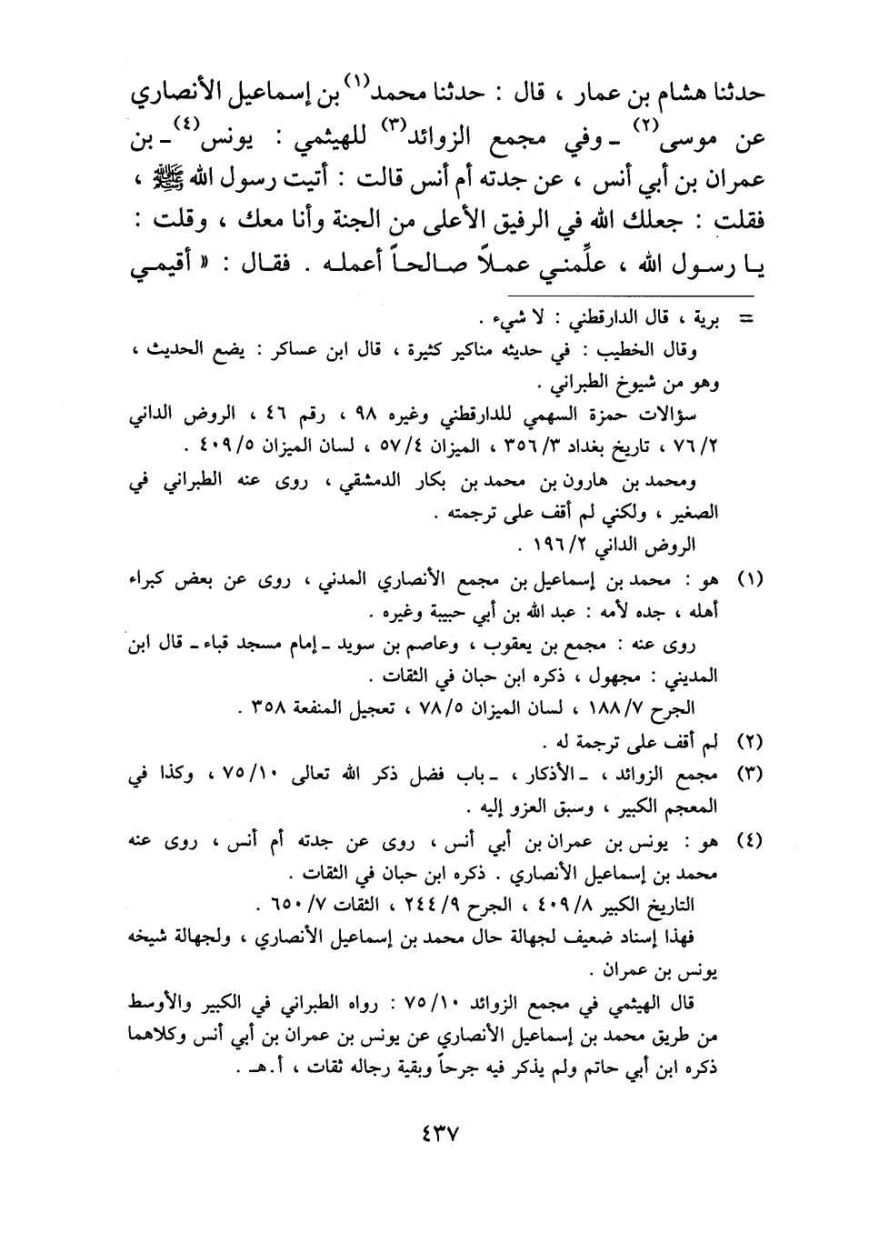 حدثنا هشام بن عمار، قال: حدثنا محمد بن إسماعيل الأنصاري عن موسى -وفي مجمع الزوائد للهيثمي: يونس- بن عمران بن أبي أنس، عن جدته أم أنس قالت: أتيت رسول الله - صلى الله عليه وسلم -، فقلت: جعلك الله في الرفيق الأعلى من الجنة وأنا معك، وقلت: يا رسول الله، علِّمني عملاً صالحاً أعمله. فقال: "أقيمي