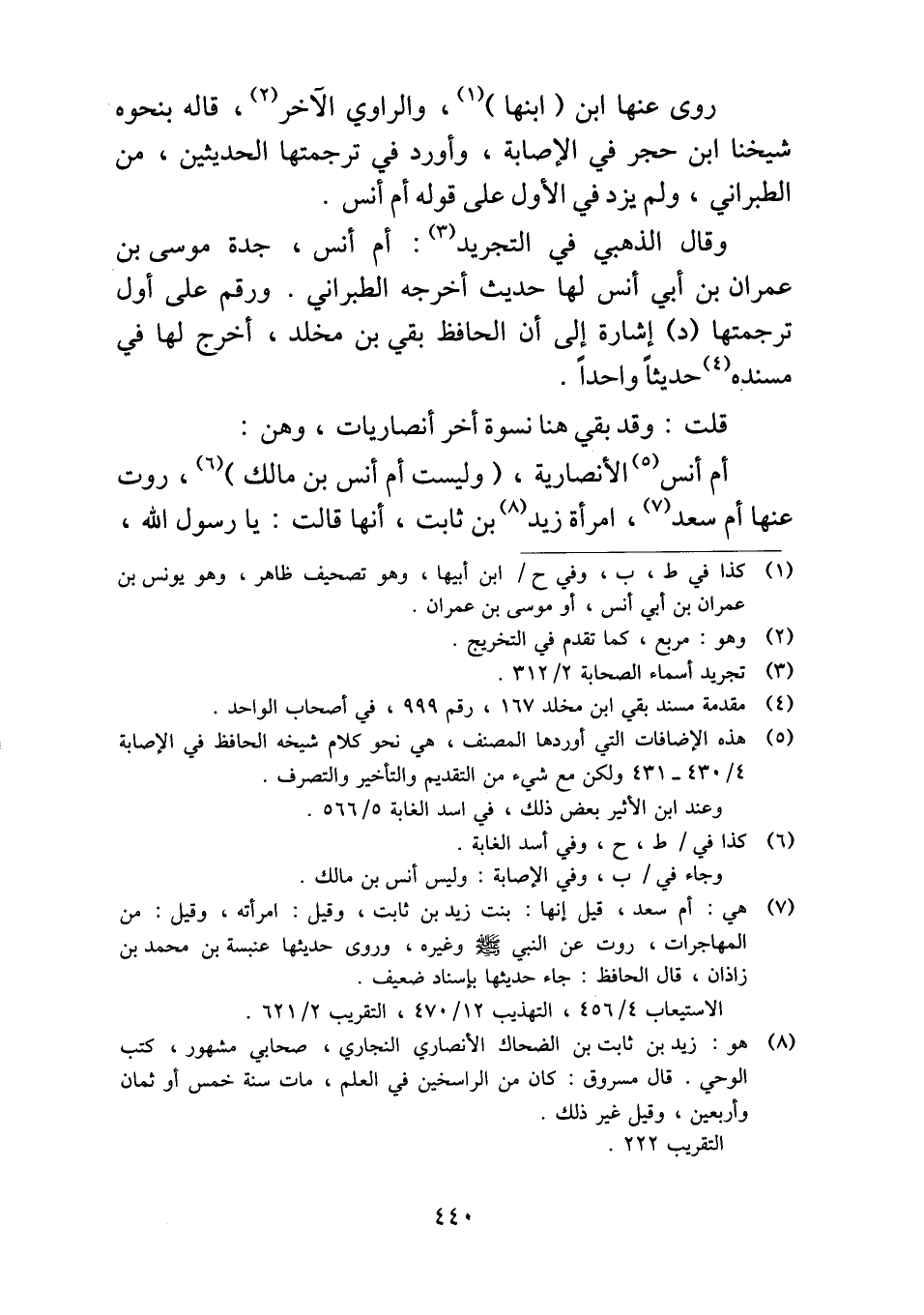 وقال الذهبي في التجريد: أم أنس، جدة موسى بن عمران بن أبي أنس لها حديث أخرجه الطبراني. ورقم على أول ترجمتها (د) إشارة إلى أن الحافظ بقي بن مخلد، أخرج لها في مسنده حديثاً واحداً.