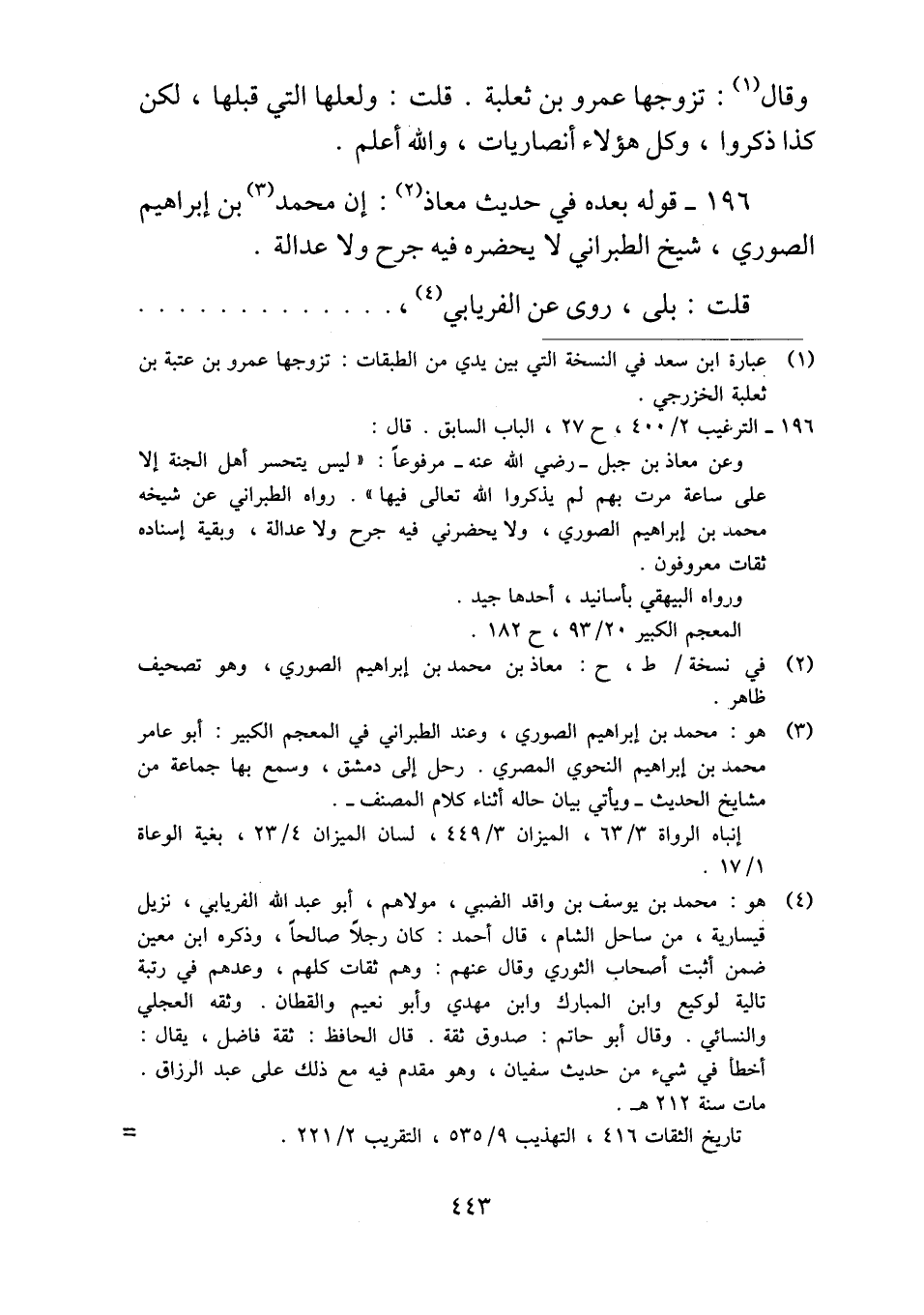 ١٩٦ - قوله بعده في حديث معاذ: إن محمد بن إبراهيم الصوري، شيخ الطبراني لا يحضره فيه جرح ولا عدالة.