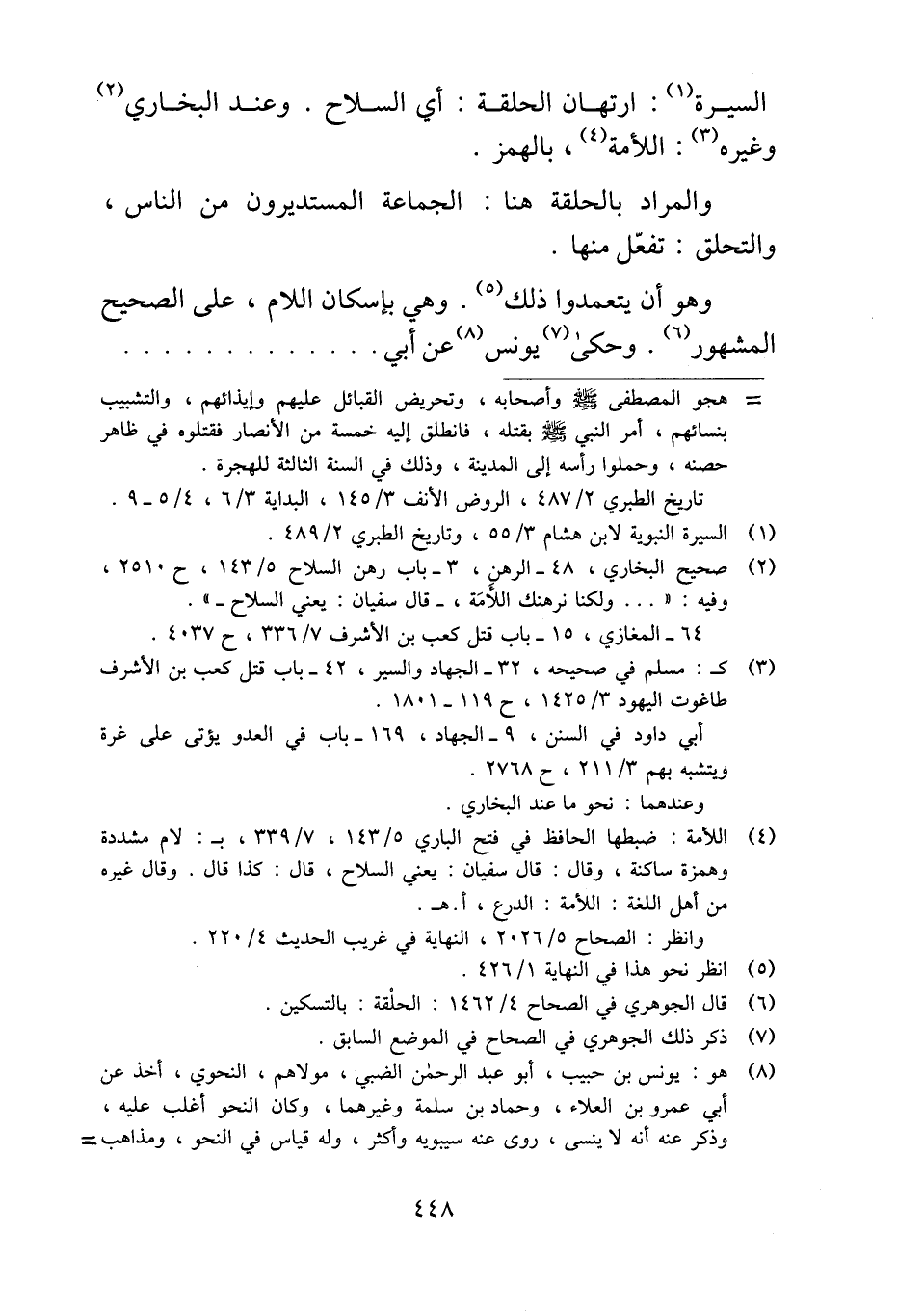 السيرة: ارتهان الحلقة: أي السلاح. وعند البخاري وغيره: اللأمة، بالهمز.