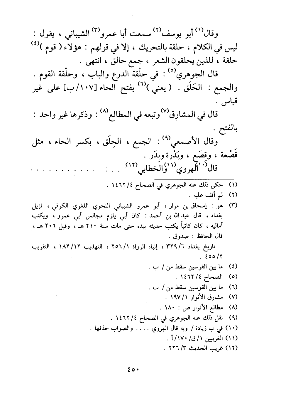 وقال أبو يوسف سمعت أبا عمرو الشيباني، يقول: ليس في الكلام، حلقة بالتحريك، إلا في قولهم: هؤلاء (قوم) حلقة، للذين يحلقون الشعر، جمع حالق، انتهى.