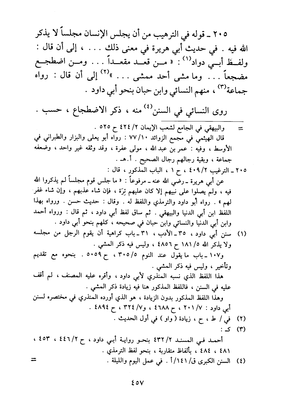 ٢٠٥ - قوله في الترهيب من أن يجلس الإنسان مجلساً لا يذكر الله فيه. في حديث أبي هريرة في معنى ذلك ... ، إلى أن قال: ولفظ أبي دواد: "من قعد مقعداً ... ومن اضطجع مضجعاً ... وما مشى أحد ممشى ... " إلى أن قال: رواه جماعة، منهم النسائي وابن حبان بنحو أبي داود.