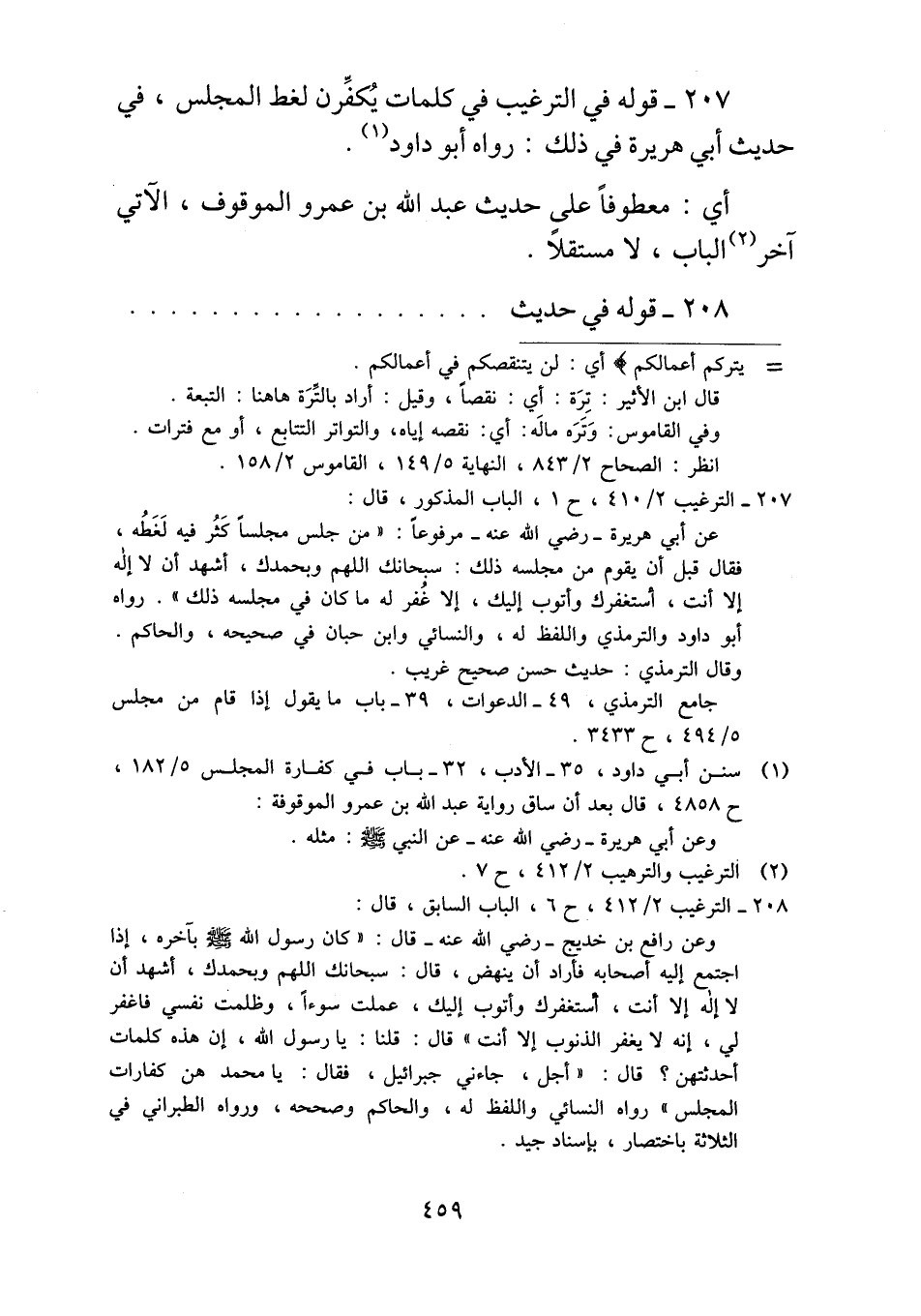 ٢٠٧ - قوله في الترغيب في كلمات يُكفِّرن لغط المجلس، في حديث أبي هريرة في ذلك: رواه أبو داود.