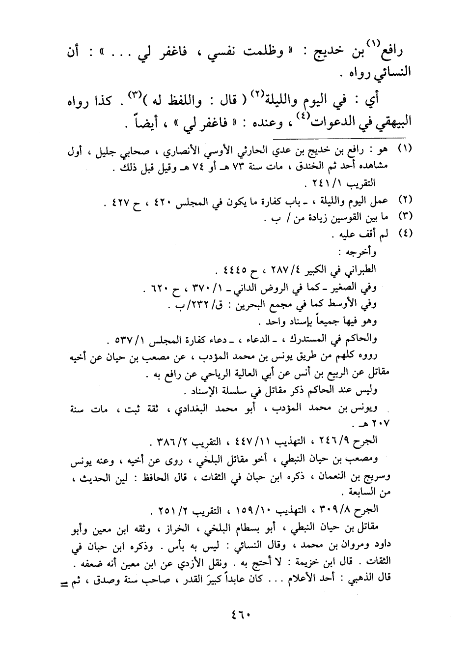 رافع بن خديج: "وظلمت نفسي، فاغفر لي ... ": أن النسائي رواه.