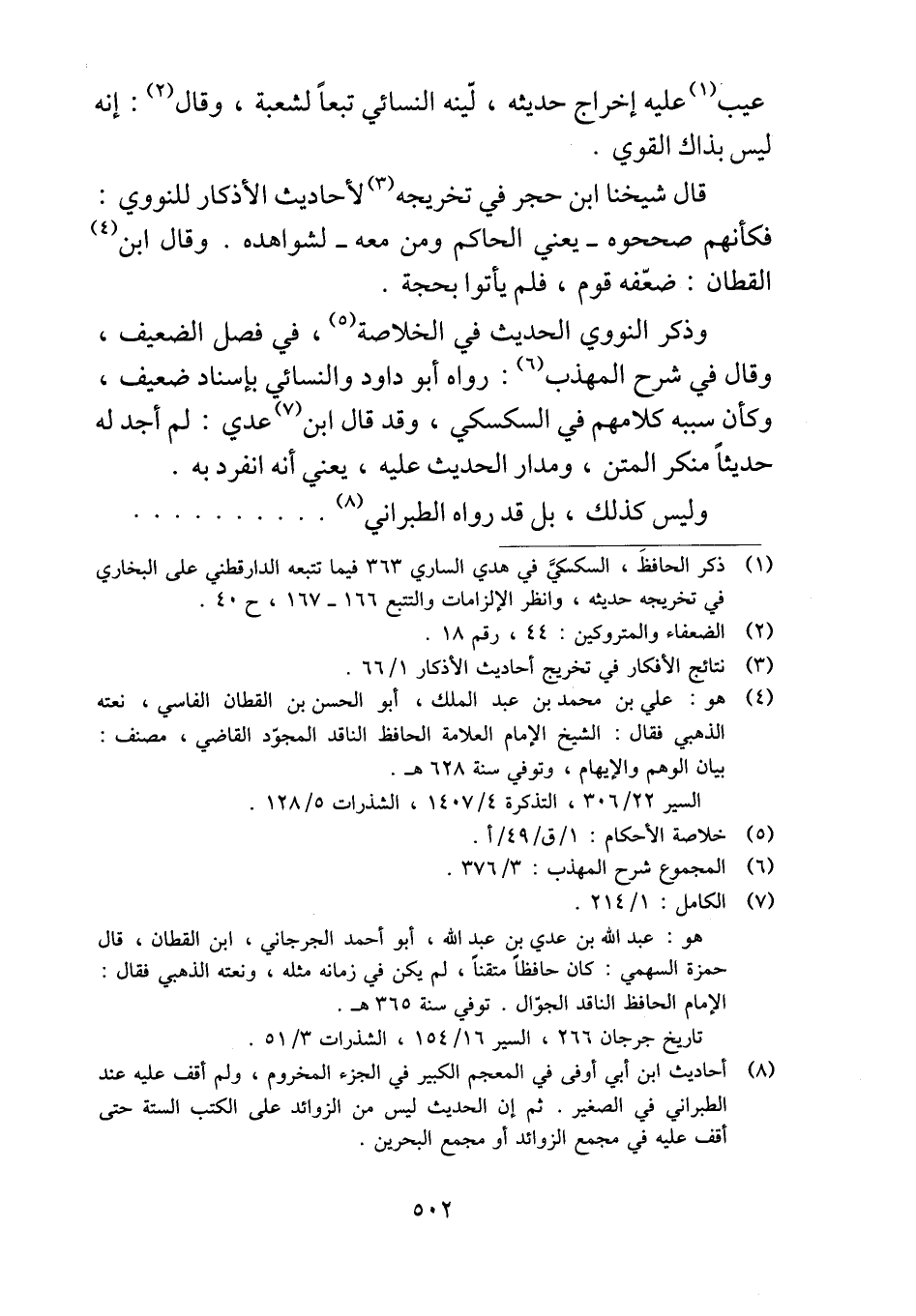 وذكر النووي الحديث في الخلاصة، في فصل الضعيف، وقال في شرح المهذب: رواه أبو داود والنسائي بإسناد ضعيف، وكأن سببه كلامهم في السكسكي، وقد قال ابن عدي: لم أجد له حديثاً منكر المتن، ومدار الحديث عليه، يعني أنه انفرد به.