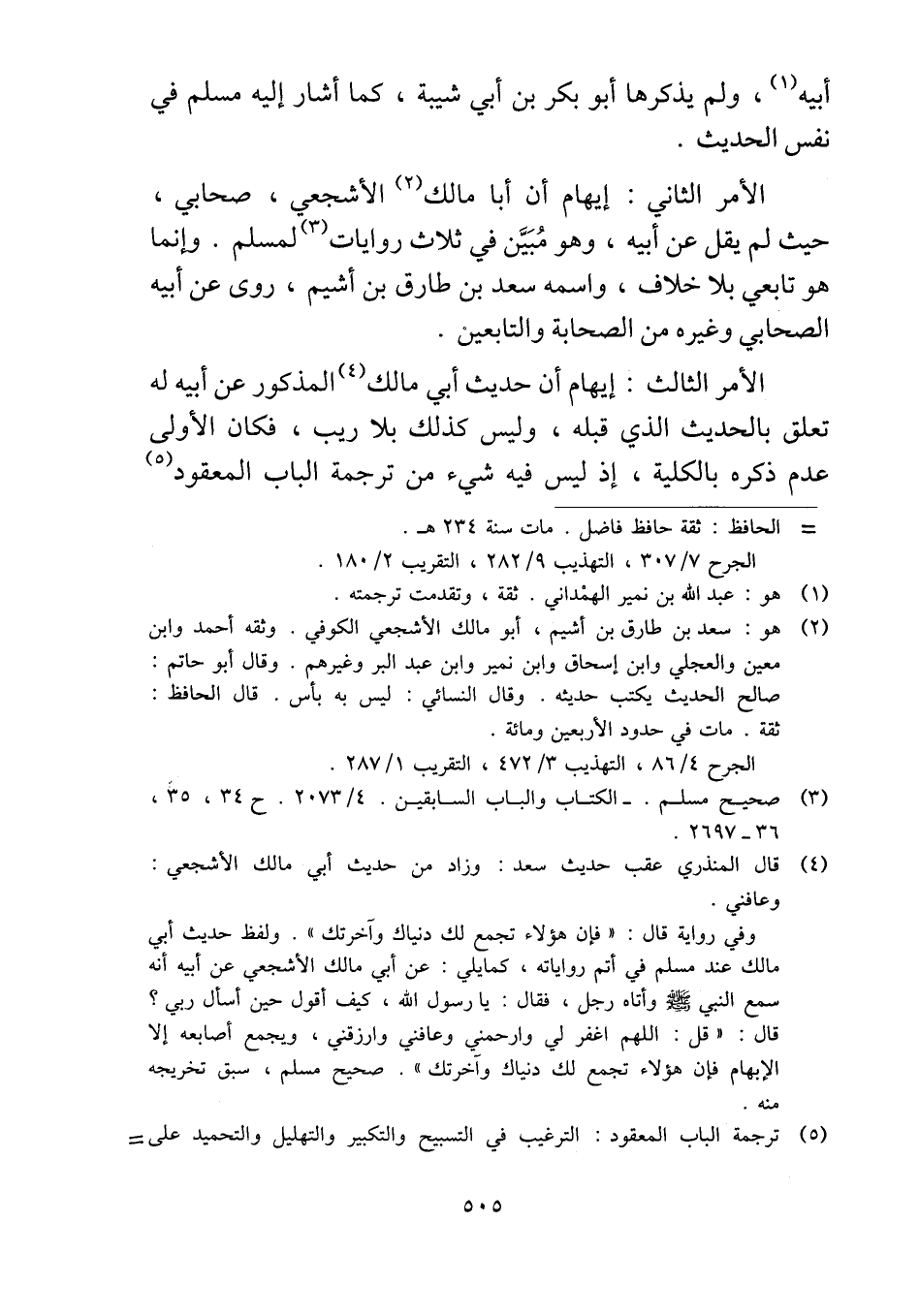 الأمر الثاني: إيهام أن أبا مالك الأشجعي، صحابي، حيث لم يقل عن أبيه، وهو مُبَيَّن في ثلاث روايات لمسلم. وإنما هو تابعي بلا خلاف، واسمه سعد بن طارق بن أشيم، روى عن أبيه الصحابي وغيره من الصحابة والتابعين.