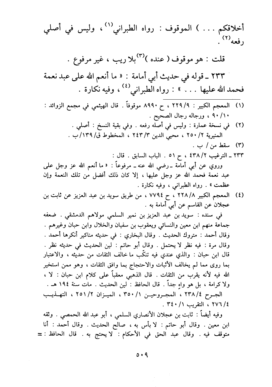 ٢٣٣ - قوله في حديث أبي أمامة: "ما أنعم الله على عبد نعمة فحمد الله عليها ... ": رواه الطبراني، وفيه نكارة.