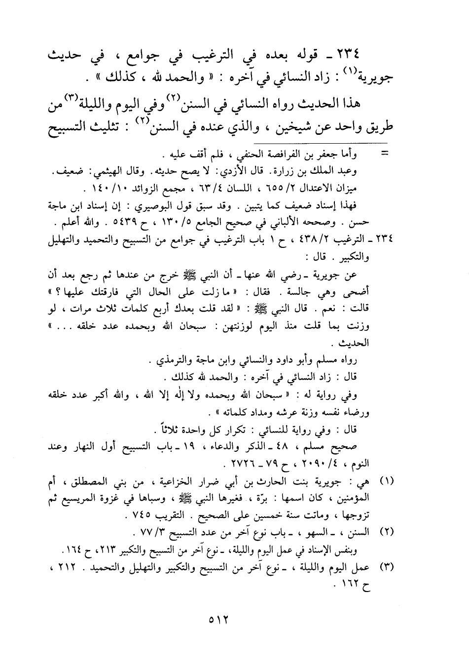 ٢٣٤ - قوله بعده في الترغيب في جوامع، في حديث جويرية: زاد النسائي في آخره: "والحمد لله، كذلك".