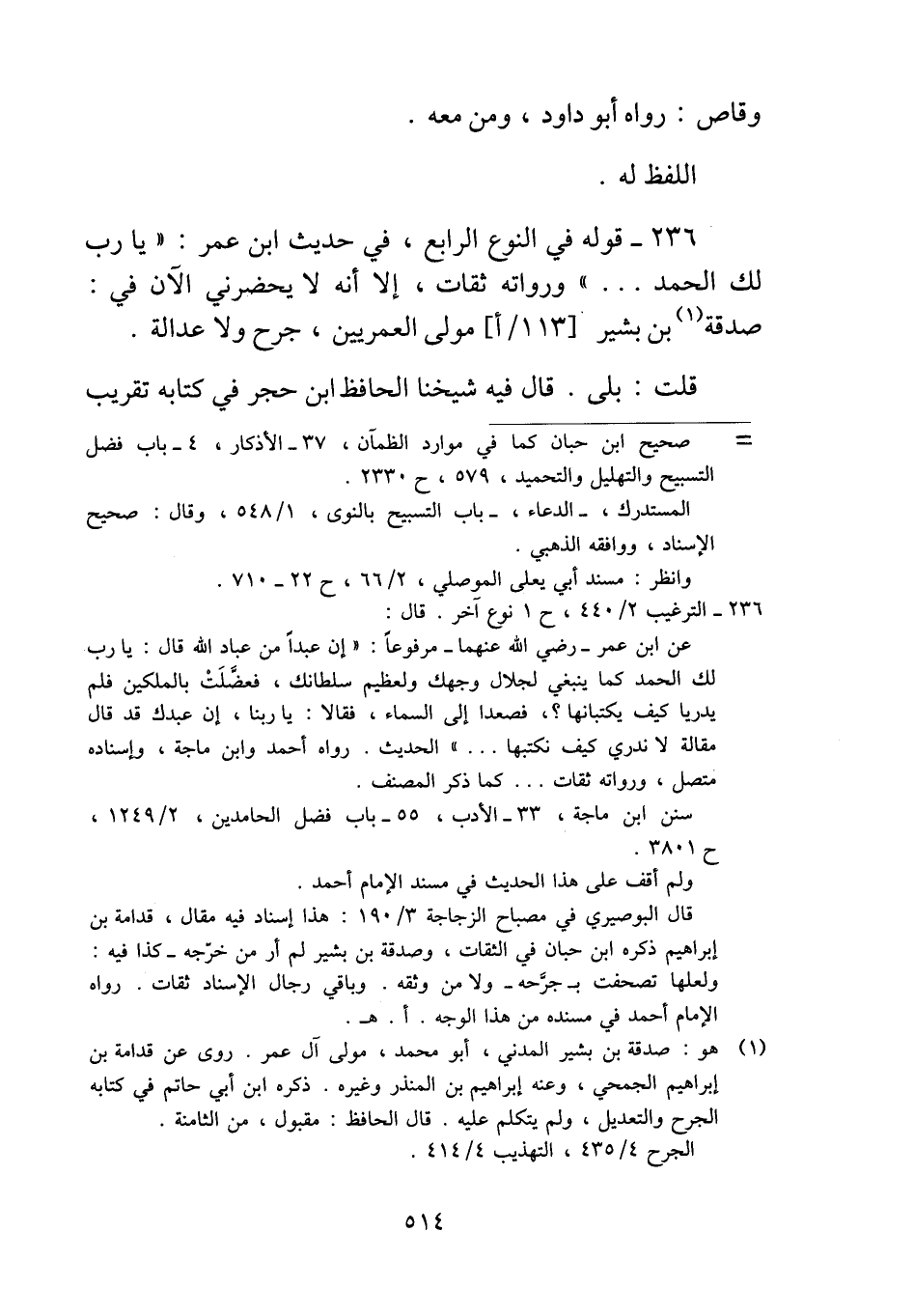 ٢٣٦ - قوله في النوع الرابع، في حديث ابن عمر: "يا رب لك الحمد ... " ورواته ثقات، إلا أنه لا يحضرني الآن في: صدقة بن بشير مولى العمريين، جرح ولا عدالة.