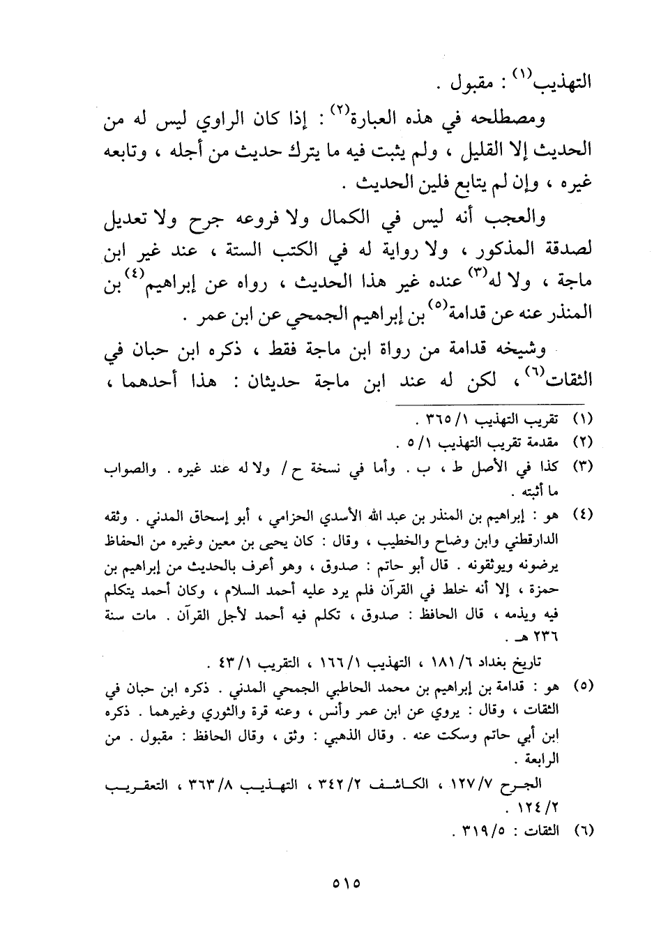 والعجب أنه ليس في الكمال ولا فروعه جرح ولا تعديل لصدقة المذكور، ولا رواية له في الكتب الستة، عند غير ابن ماجة، ولا له عنده غير هذا الحديث، رواه عن إبراهيم بن المنذر عنه عن قدامة بن إبراهيم الجمحي عن ابن عمر.