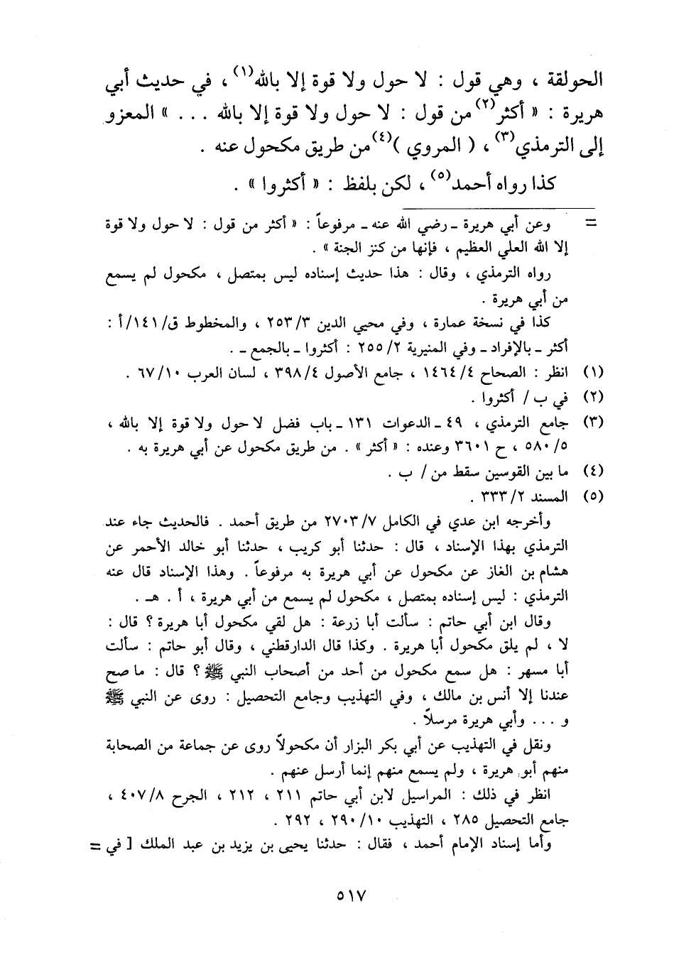 الحولقة، وهي قول: لا حول ولا قوة إلا بالله، في حديث أبي هريرة: "أكثر من قول: لا حول ولا قوة إلا بالله ... " المعزو إلى الترمذي، (المروي) من طريق مكحول عنه.