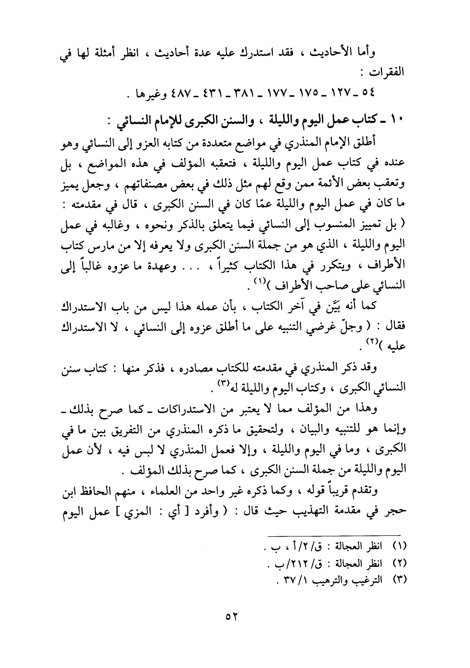 أطلق الإمام المنذري في مواضع متعددة من كتابه العزو إلى النسائي وهو عنده في كتاب عمل اليوم والليلة، فتعقبه المؤلف في هذه المواضع، بل وتعقب بعض الأئمة ممن وقع لهم مثل ذلك في بعض مصنفاتهم، وجعل يميز ما كان في عمل اليوم والليلة عمّا كان في السنن الكبرى، قال في مقدمته: (بل تمييز المنسوب إلى النسائي فيما يتعلق بالذكر ونحوه، وغالبه في عمل اليوم والليلة، الذي هو من جملة السنن الكبرى ولا يعرفه إلا من مارس كتاب الأطراف، ويتكرر في هذا الكتاب كثيراً, ... وعهدة ما عزوه غالباً إلى النسائي على صاحب الأطراف) (١).