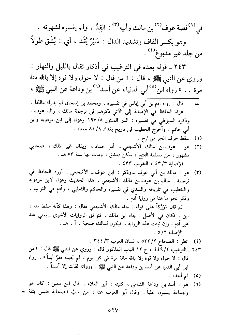 ٢٤٣ - قوله بعده في الترغيب في أذكار تقال بالليل والنهار: وروي عن النبي - صلى الله عليه وسلم -، قال: "من قال: لا حول ولا قوة إلا بالله مئة مرة .. " رواه ابن أبي الدنيا، عن أسد بن وداعة عن النبي - صلى الله عليه وسلم -،